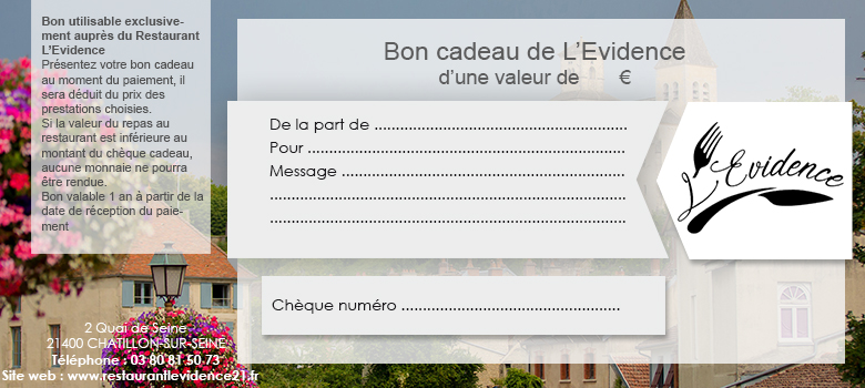 Grâce à ces bons cadeaux, la personne de votre choix pourra profiter d’un moment agréable autour d’un repas convivial au restaurant l’Evidence à Châtillon-sur-Seine (21 – Côte d’or).